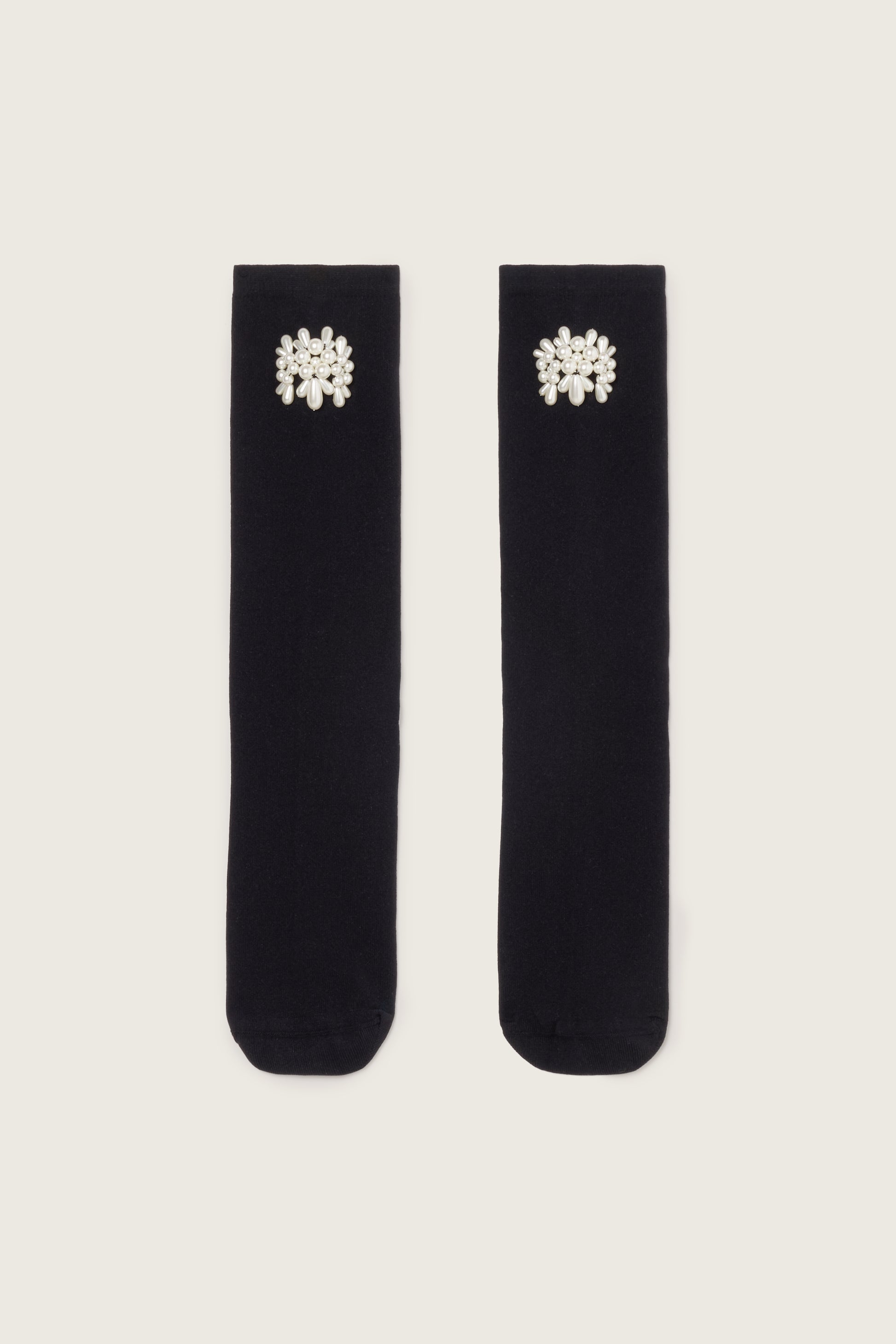 A pair of medium weight knit socks featuring a a cluster of faux pearl beading to resemble a bouquet of flowers. Embellished socks have become a staple item for Simone Rocha.